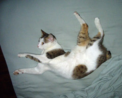 Cats have moods, and things can piss them off. They are not unlike humans in that regard. They are emotional and can have their feelings hurt. When my girlfriend moved in with us, the fur went flying! Mai-loo wouldn’t let Oam anywhere near her. To show her utter displeasure, she peed on Oam’s pillow. But instead of getting angry, Oam took a different approach. She laid in wait for Mai-loo, just as Mai-loo would do with me, and when she pranced by, Oam sprang out! Mai-loo jumped four feet straight up and jetted out of the house like a cartoon character. Now, you might think this would be the worst possible thing to do, but later that same day, Mai-loo bushwhacked Oam in the same way. From that day on, they were inseparable.