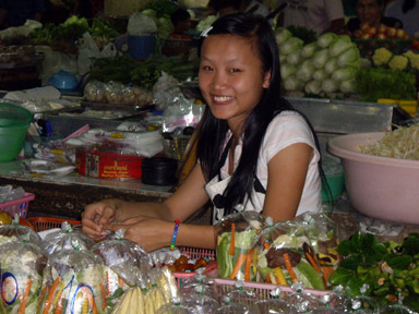 Still, insects and other odd critters (that I really won’t mention) aside, there are plenty of yummy things throughout my wonderful market. Actually, I go to two markets. One is walking distance from my house, and the other is way across town, but well-worth the weekly trip. Because these markets are for the locals, very few foreigners visit them. Most of the time, I am the only Westerner in sight. It took years before I gained the trust of the venders where they laugh and joke with me, even though they speak so fast I hardly understand a word they’re saying. No one ever tries to overcharge me, in fact they usually replace some fruit or other item I’ve picked out, for a much larger or better specimen.